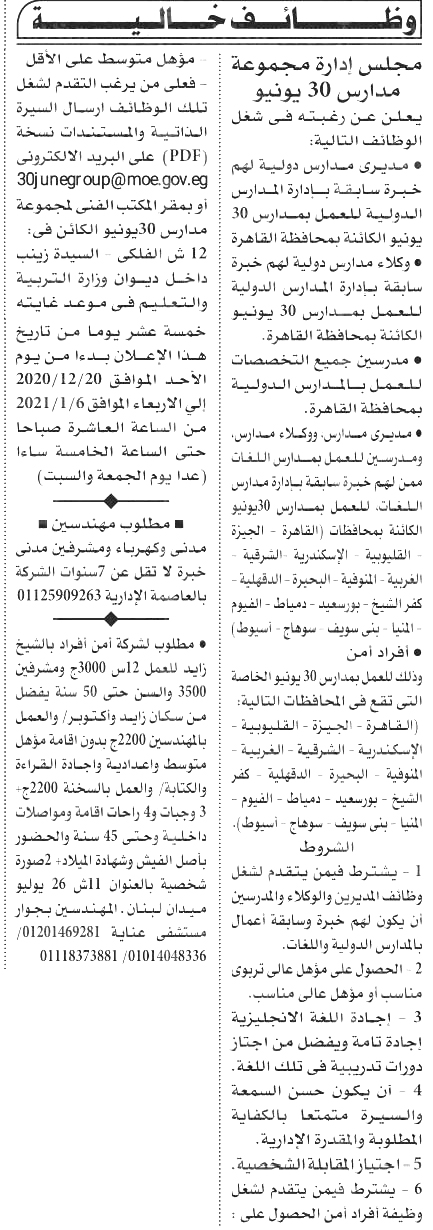 1- وظائف وزارة التربية والتعليم مجلس ادارة مجموعة مدارس 30 يونيو يعلن عن رغبته فى شغل الوظائف التالية - مديرى مدارس دولية لهم خبرة سابقة بادارة المدارس الدولية للعمل بمدارس 30 يونيو الكائنة بمحافظة القاهرة - وكلاء مدارس دولية لهم خبرة سابقة بادارة المدارس الدولية للعمل بمدارس 30 يونيو الكائنة بمحافظة القاهرة- مدرسين جميع التخصصات للعمل بالمدارس الدولية بمحافظة القاهرة- مديري مدارس ووكلاء مدارس ومدرسين للعمل بمدارس اللغات ممن لهم خبرة سابقى بادارة مدارس اللغات للعمل بمدارس 30 يونيو الكائنة بمحافظات القاهرة والجيزة والقليوبية والاسكندرية والشرقية والغربية والمنوفية والبحيرة والدقهلية وكفر الشيخ وبورسعيد ودمياط والفيوم والمنيا وبنى سويف وسوهاج واسيوط - افراد امن وذلك للعمل بمدارس 30 يوينو الخاصة التى تقع فى المحافظات سابقة الذكر