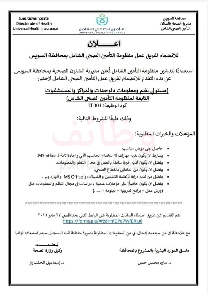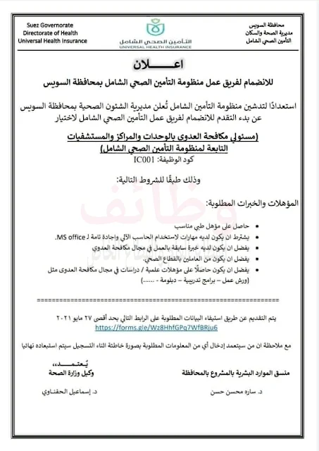 تعلن مديرية الصحة والسكان بمحافظة السويس عن حاجتها للانضمام لفريق عمل منظومة التأمين الصحى الشامل بمحافظة السويس استعداداً لتدشين منظومة التأمين الشامل تعلن مديرية الشئون الصحية بمحافظة السويس عن بدء التقدم للانضمام لفريق عمل التأمين الصحى الشامل لاختيار الوظائف الاتية :-