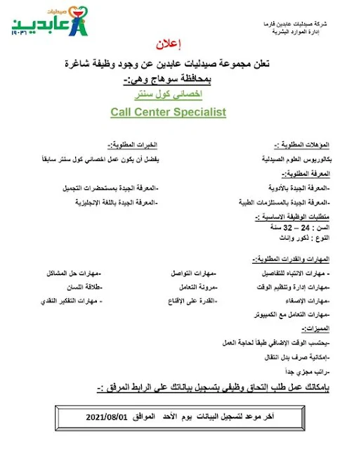 اعلانات توظيف بمجموعات صيدليات عابدين بمحافظة سوهاج وظيفة كول سنتر