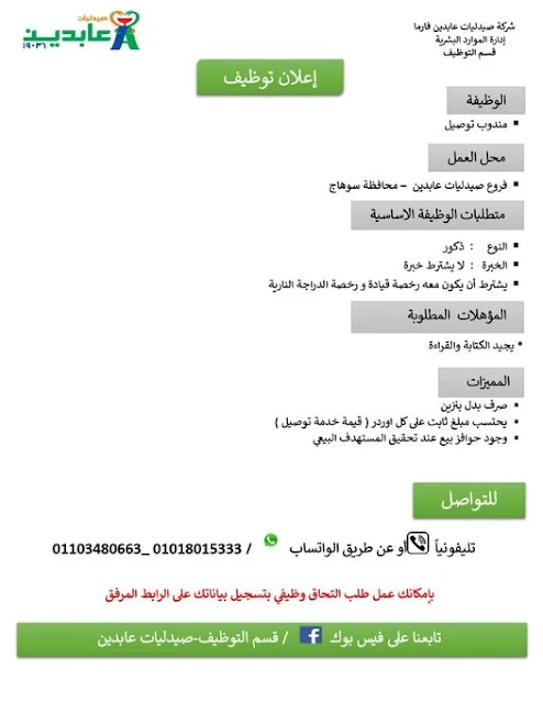 اعلان عن وظيفة مندوب توصيل بفروع صيدليات عابدين سوهاج اعلان صادر بتاريخ اليوم 2023/3/14