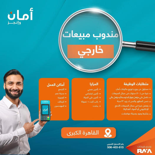 تعلن شركة أمان للدفع الالكتروني إحدى شركات مجموعة رايه القابضة للاستثمارات المالية عن رغبتها فى شغل وظيفة مندوب مبيعات بمحافظات القاهره و الجيزة :
