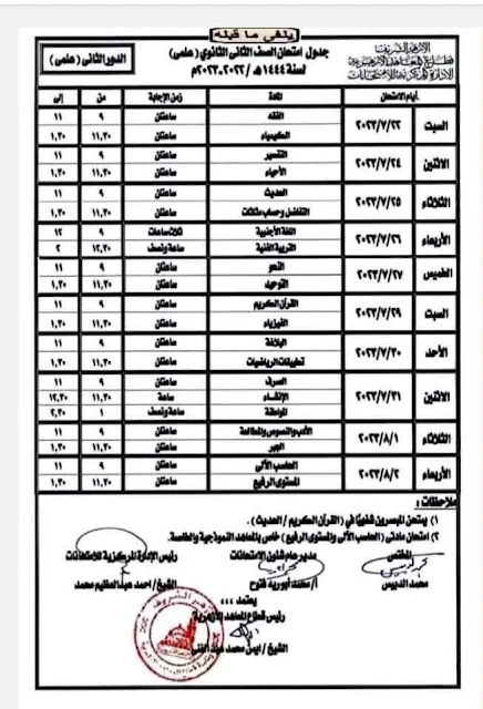 وحيث إنه من المقرر بداية امتحانات الدور الثاني لصفوف النقل الابتدائي والإعدادي والثانوي ونقل القراءات والنقل الإعدادي والثانوي بمعاهد البحوث الإسلامية يوم السبت الموافق ٢٠٢٣/٧/٢٣م