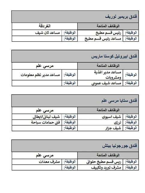 ولغات إنجليزي وروسي وايطالي وروماني وتشيكي والماني،ومدير سلامة الغذاء، ومدير اشراف داخلى، وشيف ايطالى، وحلوانى، وموظف استقبال، ومشرف حجز، ومنقذ شاطئ، ومدير مطعم، وطباخ، ومساعد طباخ، وجناينى، ومساعد كبير مهندسين، وموظف علاقات نزلاء، ومنسق تدريب، ومضيف، ومشرف غرف،وافراد امن،وعامل سكن، ومشرف استلام، ومراجع ليلي،محاسب اول، ومساعد مدير مشتريات،ومدير مشتريات، ومدير تدريب، ومدير ليلى،ومدير نشاط رياضى،ومساعد مدير مكافحة افات، وفنى غلايات، وبحار، وموظف مدفوعات، وموظف خدمة عملاء، وعامل تجهيز وتحضير، وفني حمامات سباحة، وذلك في العديد من الفنادق والمنشآت السياحية الكبري العاملة بمدينة الغردقة ،وسفاجا، ومرسي علم التابعين للمحافظة كما هو موضح بالجدول المرفق بالبيان ...