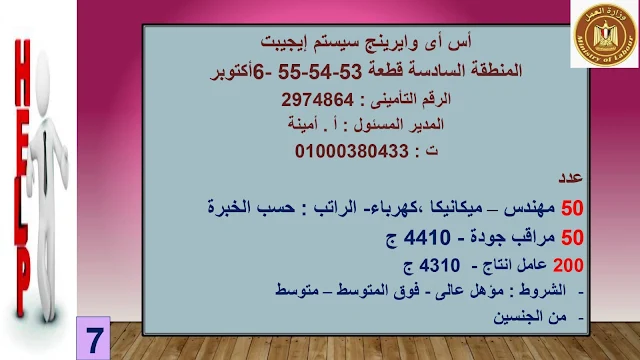 وجاء في البيان الصحفي ،أن نشرة التوظيف الدورية التي تصدرها"الوزارة" اليوم من خلال الإدارة العامة للتشغيل برئاسة هبه أحمد مدير عام التشغيل بالوزارة، وإعداد منى شوقي باحث أول بالإدارة، تُعلن عن فرص عمل جديدة ،متوفرة في 11 محافظة،هي: القاهرة، والجيزة ، وبورسعيد، والقليوبية، والغربية ،وأسيوط، وقنا ،وسوهاج ، ودمياط ، والوادى الجديد ، والفيوم ...وفي تخصصات: مهندسين كهرباء وميكانيكا، ومحاسبين ، وصيدليين ، ومساعد صيدلى ، ومحضر طلبيات ، ومدير فرع ، ورئيس فريق ، وأخصائي موارد بشرية ، ومراقب جودة ، وعمال إنتاج ، وأفراد أمن ، وعمال مخازن ، وأخصائيين مشتريات، ومندوبين مبيعات ، ومحصلين ،ووسطاء تأمين،ومندوبين توزيع،وكافة أعمال الفندقة،وعمال خياطة بكافة الأقسام،وفنيين جميع التخصصات،وعمال نظافة،وتخصصات أخرى..