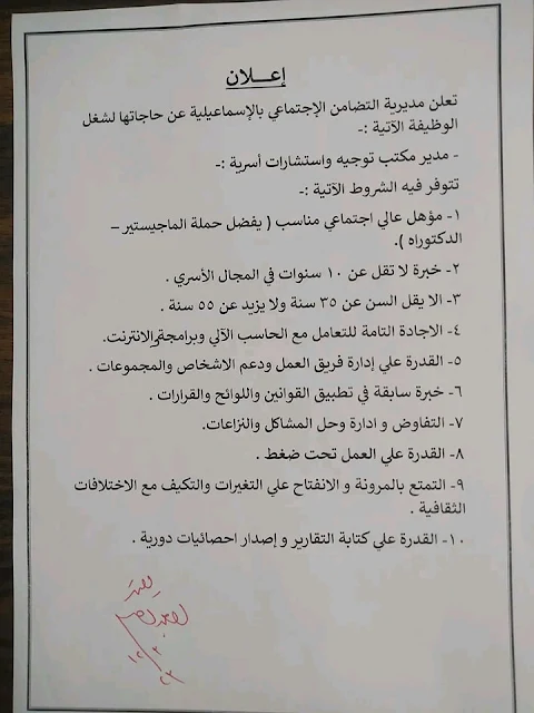 وعلي الراغبين لشغل هذه الوظائف التقدم لمديرية التضامن الاجتماعي بالإسماعيلية خلف مجمع المحاكم