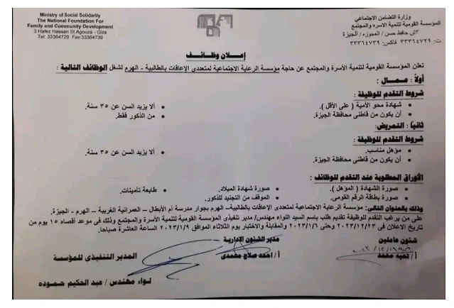 تعلن المؤسسة القومية لتنمية الأسرة والمجتمع عن حاجة مؤسسة الرعاية الاجتماعية لمتعددي الإعاقات بالطالبية الهرم لشغل الوظائف التالية :