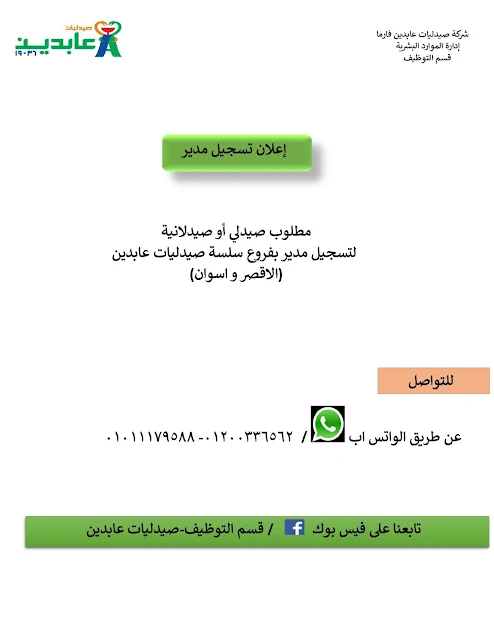 إعلان وظيفة " مساعد صيدلي - كاشير - اخصائي تجميل" صيدليات عابدين فروع المعادى القاهرة., للتقديم الرجاء إرسال البيانات على اللينك المرفق