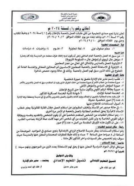 تعلن إدارة نجع حمادي التعليمية عن تلقى طلبات العمل بالحصة بالإعلان رقم (1) لسنة ٢٠٢٤م وطبقاً للكتاب رقم ٢٦ لسنة ٢٠٢١م، وذلك ابتداء من يوم الثلاثاء الموافق ٢٠٢٤/٩/٣م وحتى يوم الثلاثاء الموافق ٢٠٢٤/٩/١٠م
